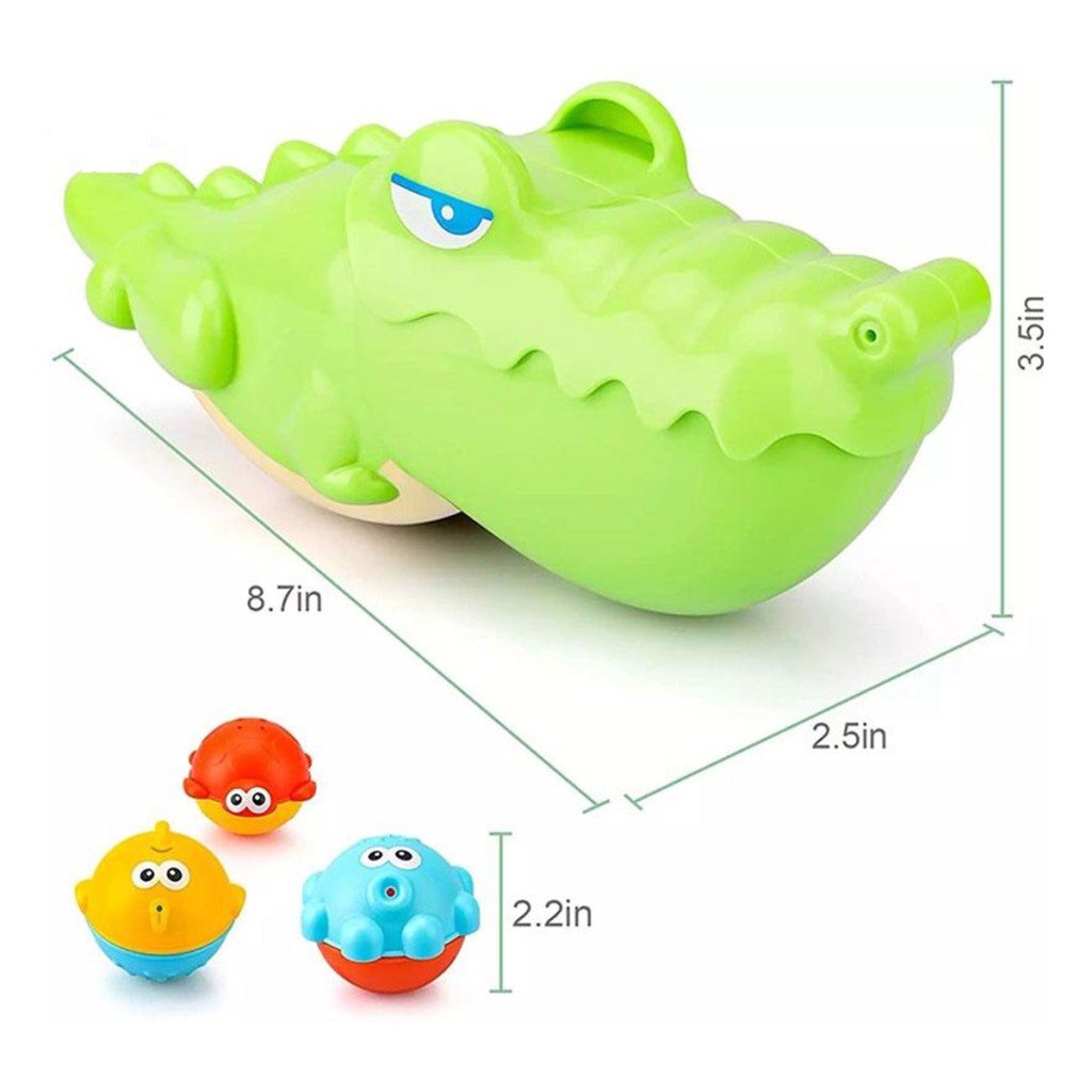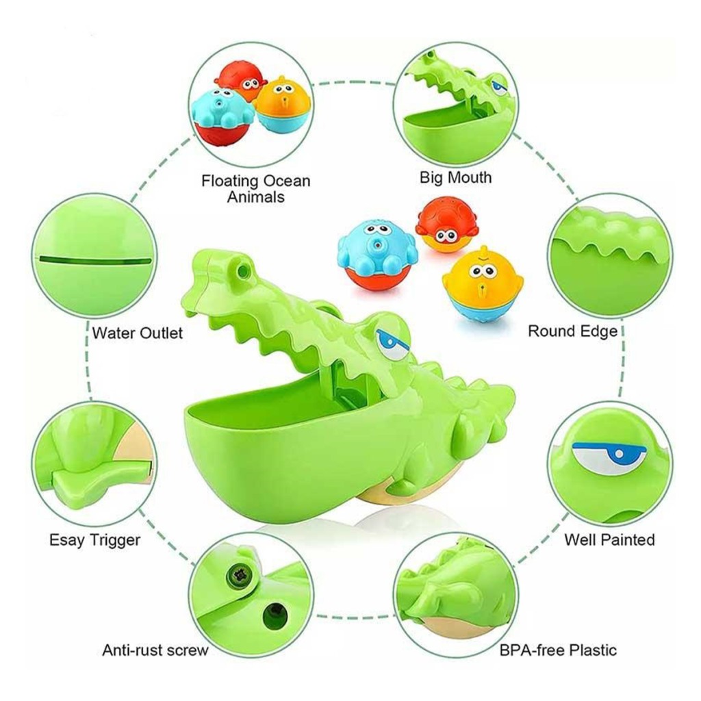 - دارای ۱ عدد تمساح با قابلیت باز و بسته شدن دهان به وسیله اهرم زیر شکم, دارای ۳ عدد اسباب بازی آبریز توپی شکل با طرح و رنگ متفاوت به شکل ماهی و لاکپشت و هشتپا