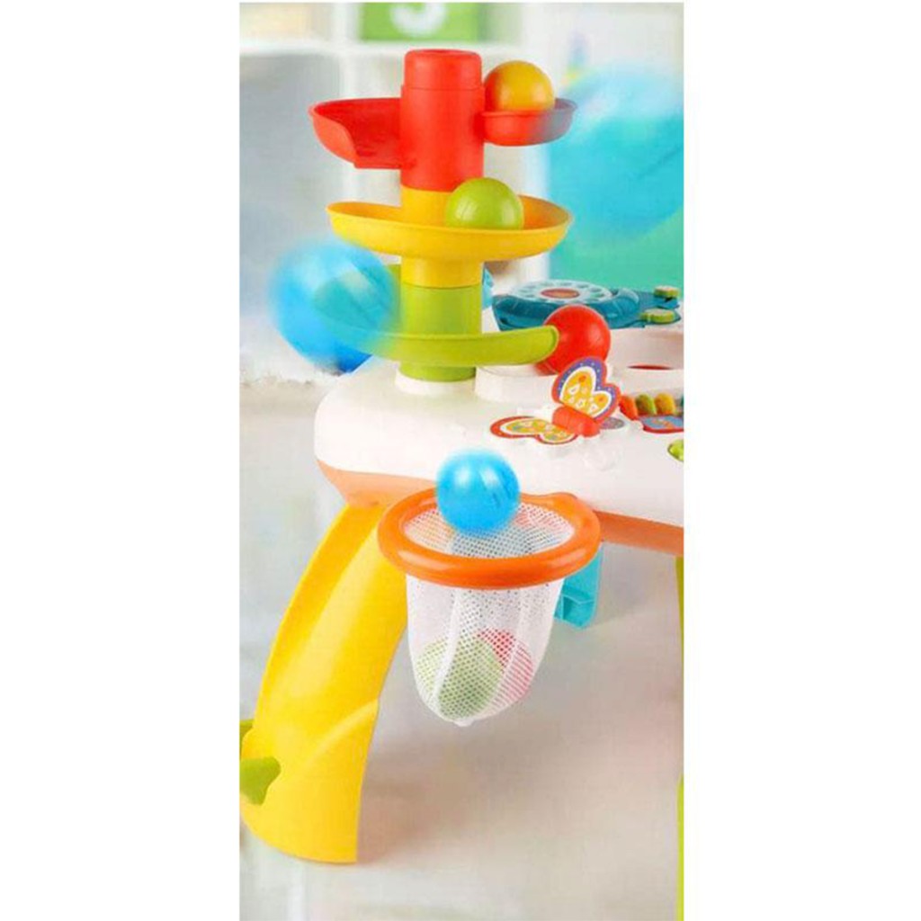 - شامل 3 عدد توپ با رنگ های متنوع و یک سرسره بزرگ روی میز قرار دارد که کودک توپ ها را داخل آن می اندازد