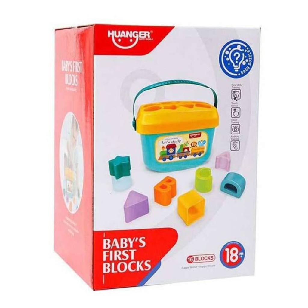 - شامل 16 عدد بلوک با طرح ها و رنگ های مختلف (اشکال هندسی و حروف با ابعاد متفاوت) که کودک باید هر کدام از آنها را داخل حفره مربوط به خود بیندازد