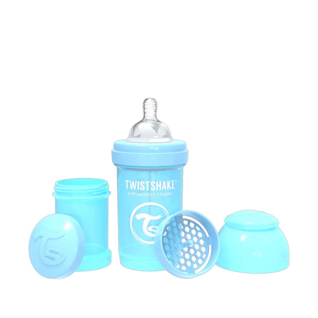 شیشه شیر طلقی 180میل تویست شیک آبی (پاستلی) برند سوئدی Twistshake تویست شیک دارای سرشیشه سیلیکونی، طراحی آرگونومیک و سری ضد نفخ مناسب نوزادان از بدو تولد می باشد.