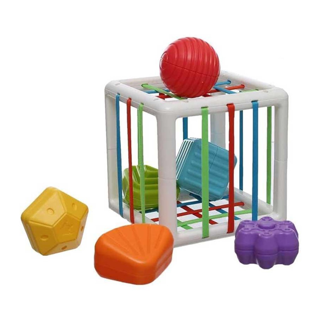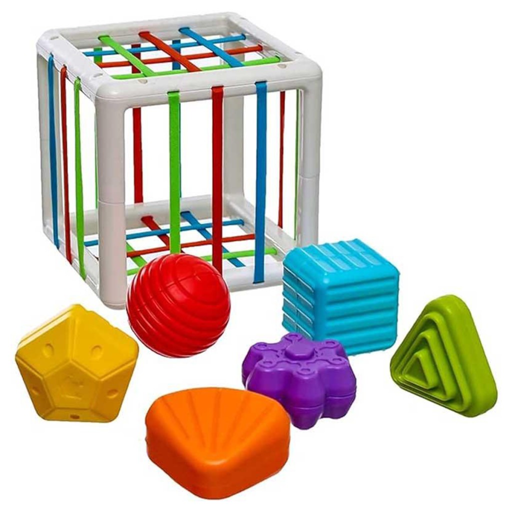 - شامل باکس با بندهای رنگی که کودک می تواند اشکال هندسی را از بین بند ها عبور داده و وارد باکس کرده و یا خارج کند