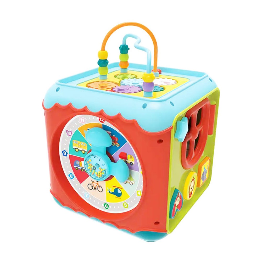 - یک سمت نیز شامل 3 توپ رنگی با یک چکش است که کودک باید هر توپ را در محل رنگ خود قرار داده و با چکش به آن ضربه بزند و آن را داخل مکعب بیندازد