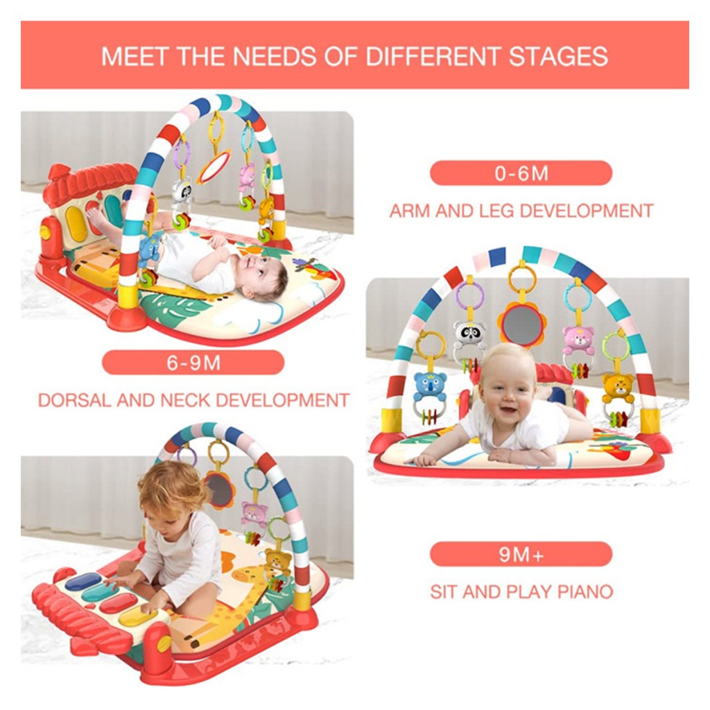 - از بدو تولد تا شش ماهگی: نوزاد در حالت دراز کش به روی شکم به بازی می کند و از آویزهای کمان قوسی شکل بالای سر خود لذت می برد