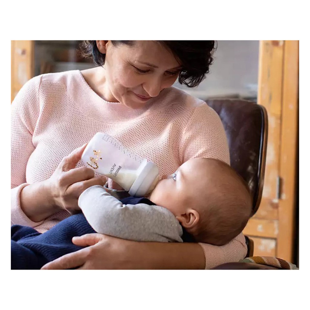 شیشه شیر نچرال ریسپانس 260 میل اونت Avent طرح زرافهبر اساس ریتم طبیعی تغذیه نوزاد طراحی شده است. این شیشه شیر دارای یک سرشیشه منحصر به فرد است که فقط زمانی شیر را رها می کند که نوزاد به طور فعال بنوشد.