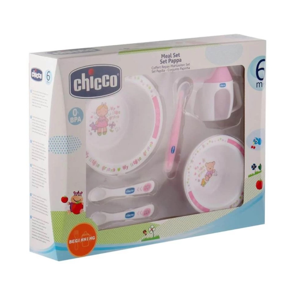 ست ظروف غذاخوری چیکو دارای 6 تکه مهم و لازم با رنگ زیبا برای سیسمونی دخترانه.