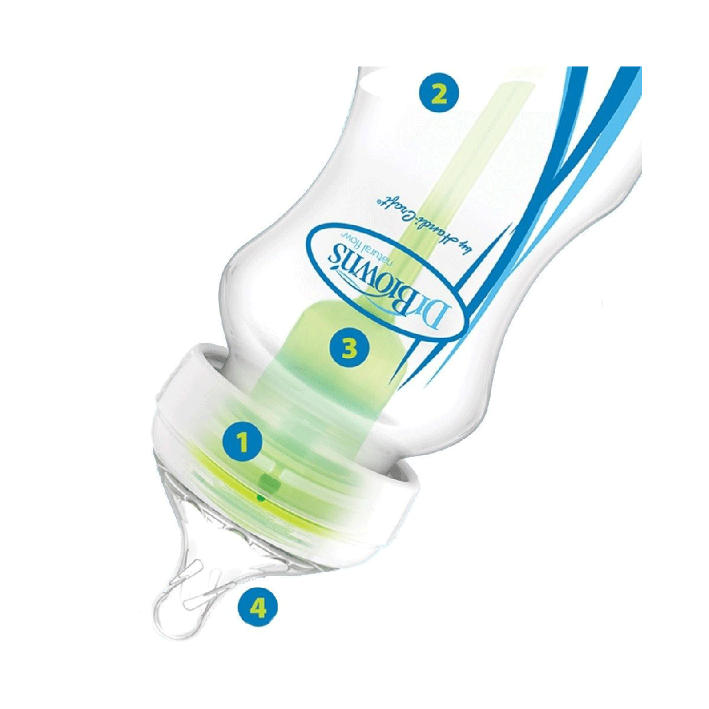 ویژگی شیشه شیر های آپشن پلاس دکتر براونز این است که هم می توانید شیشه شیر را با نی سبز رنگ داخل آن و هم بدون نی استفاده کرد. نی سبز رنگی که داخل شیشه شیر تعبیه شده است باعث می شود که هیچگونه جریان هوایی وارد معده نوزاد نشود و از دل درد و نفخ نوزاد جلوگیری می کند.