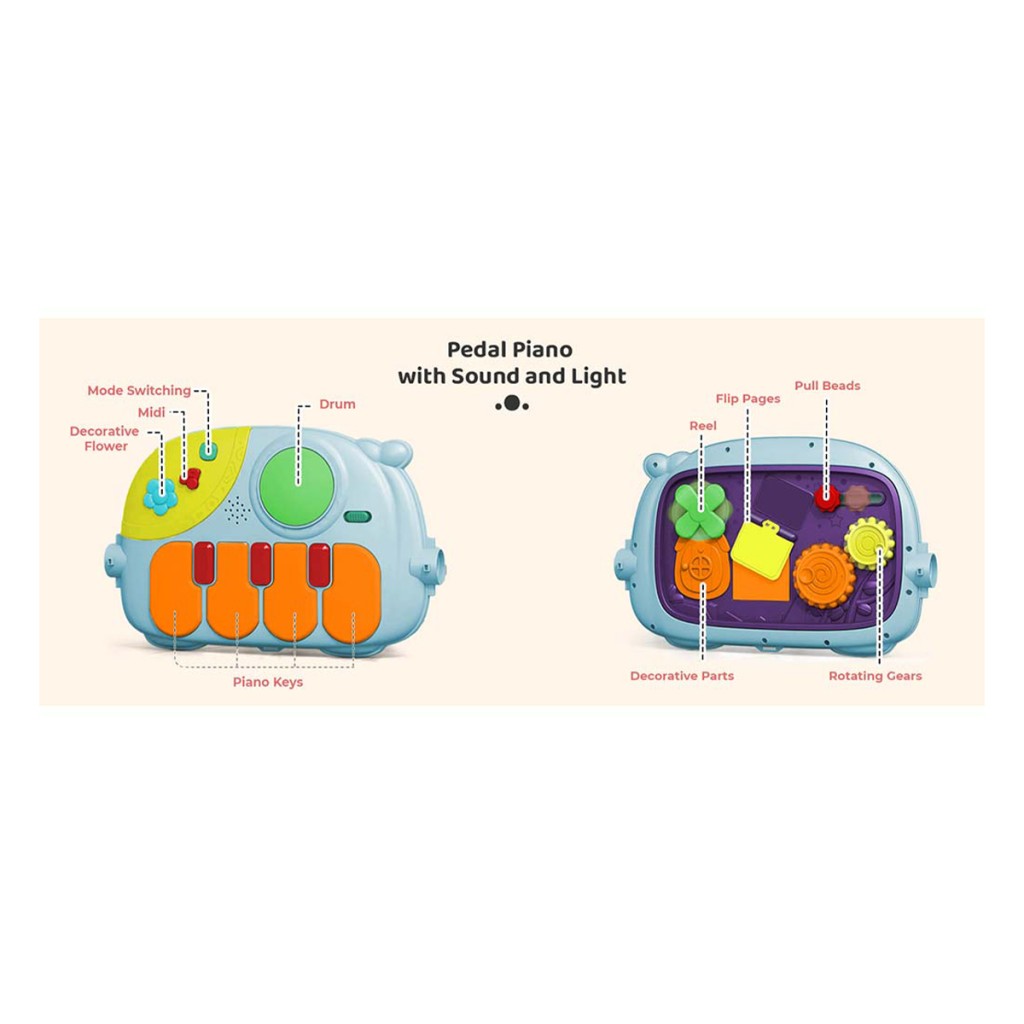 - تشک بازی دارای پنل موزیکال طرح پیانو با نور پس زمینه و با 4 دکمه موسیقی و تنظیمات صدا و …
