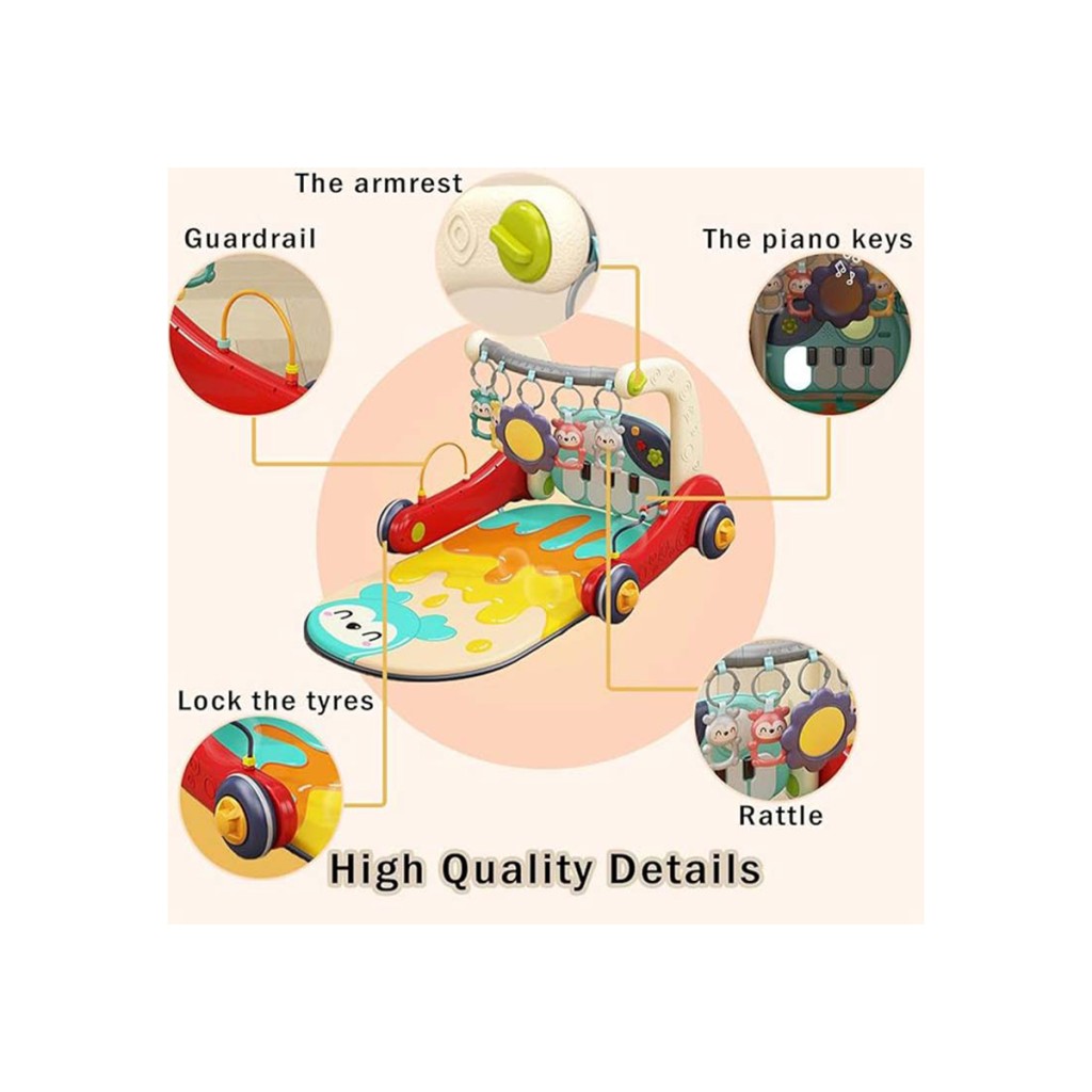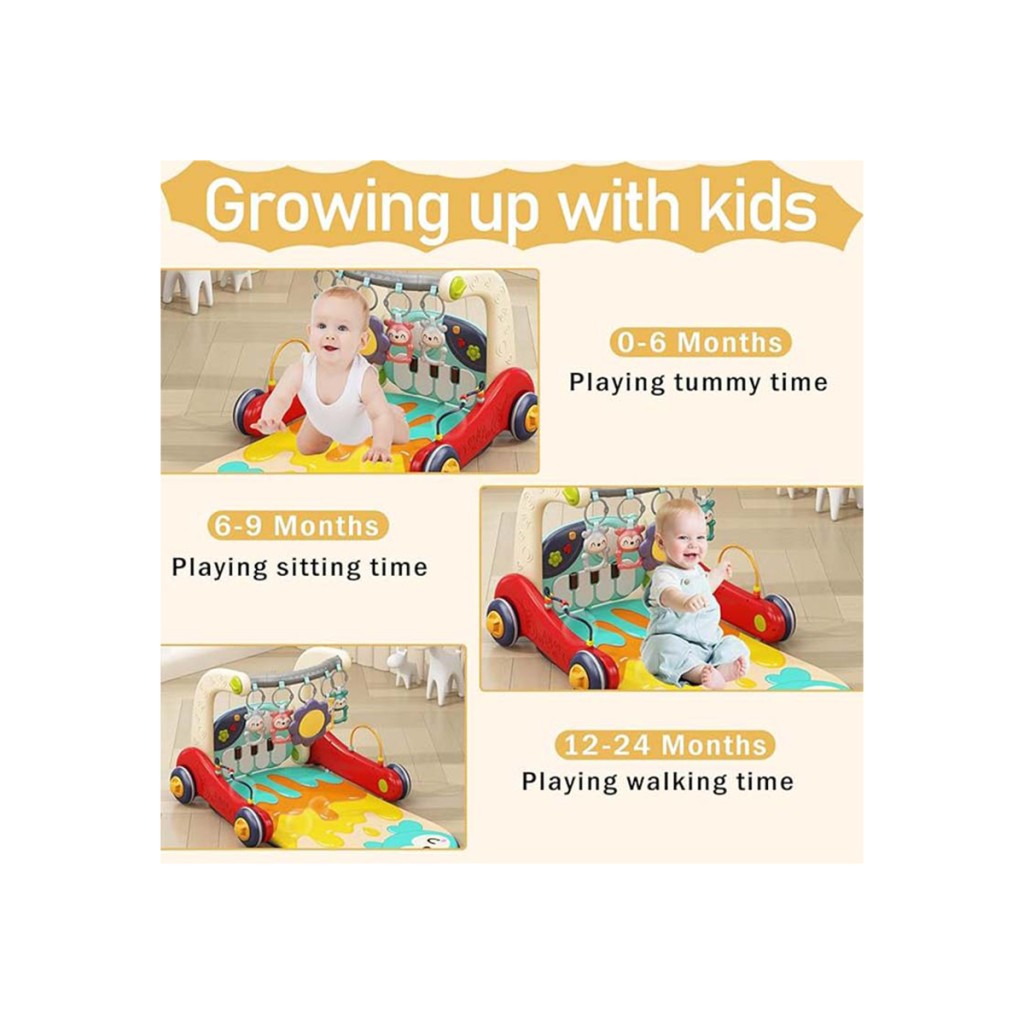 - حالت اول: تشک بازی قابل استفاده از بدو تولد تا 3 ماهگی (نوزاد خوابیده و با عروسک های آویز بازی میکند و با پا به پیانو ضربه میزند و تولید موسیقی میکند)