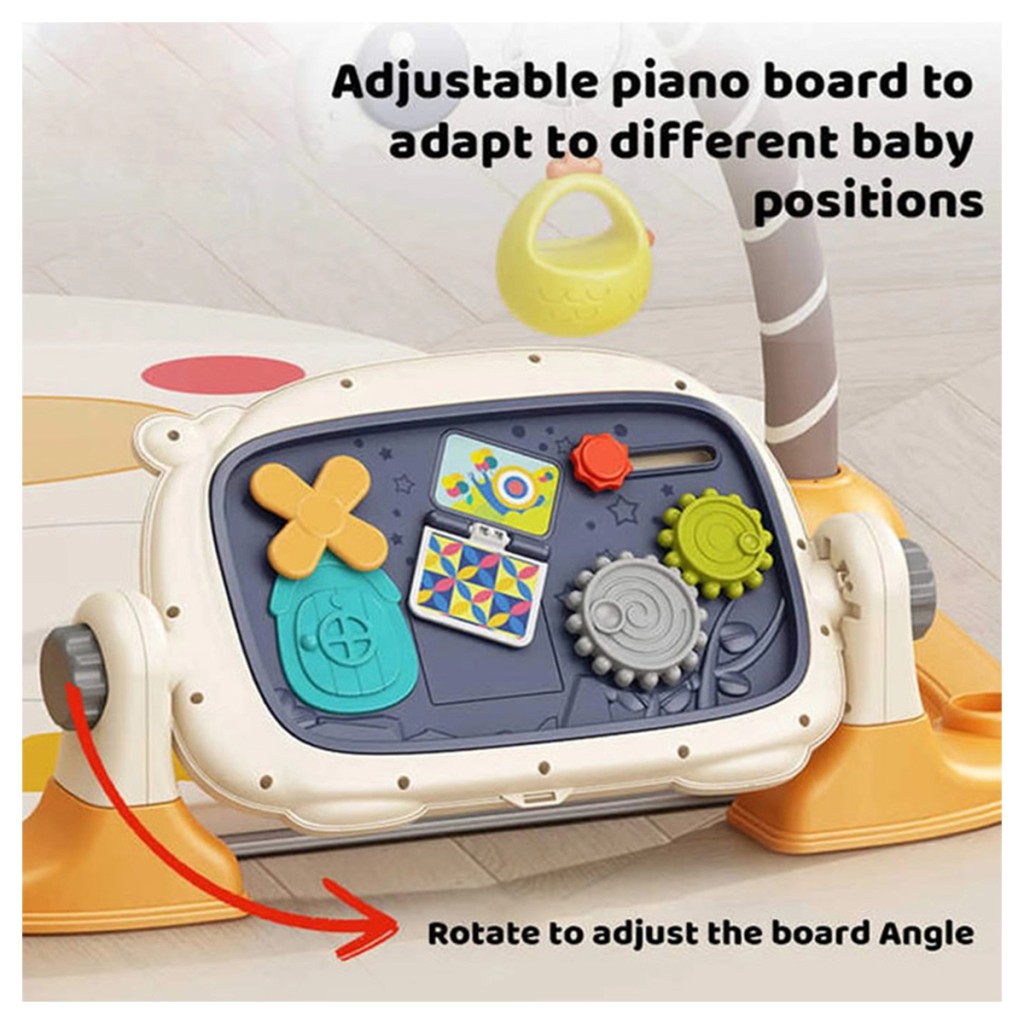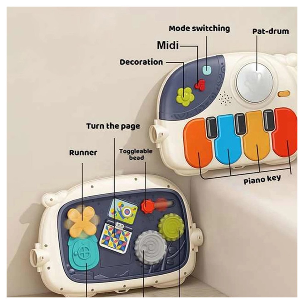 پنل موزیکال طرح پیانو با نور پس زمینه و با 4 دکمه موسیقی و رقص نور و تنظیمات صدا و … و بازی های دیگری مثل چرخ دنده، کتاب مصور و کلبه است.