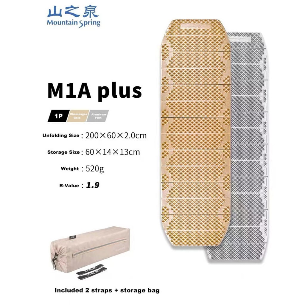 مونتین اسپرینگ برندی چینی است که در زمینه تجهیزات کمپینگ و کوهنوردی فعالیت بسیار وسیعی دارد.زیرانداز آکاردئونی "M1A Plus" مونتین اسپرینگ بسیار سبک و کم حجم می باشد که می تواند یکی از مهم ترین آیتم ها برای انتخاب زیرانداز باشد. زیرانداز M1A Plus به دلیل وزن سبک خود و آکاردئونی بودن می توانند همراه بسیار مناسبی برای راحتی شما باشند. این زیرانداز بسیار راحت و مقاوم است، طراحی بسیار زیبایی دارد و قابل استفاده برای زیر چادر و کیسه خواب میباشد.